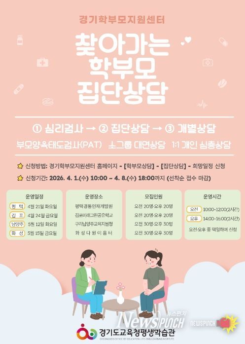 뉴스펀치 박상훈 기자 | 경기도교육청평생학습관 경기학부모지원센터가 자녀양육 과정에서 학부모가 경험하는 어려움과 고민을 함께 나누고 공감할 수 있도록 녪년 찾아가는 학부모 집단상담 프로그램’을 운영한다.