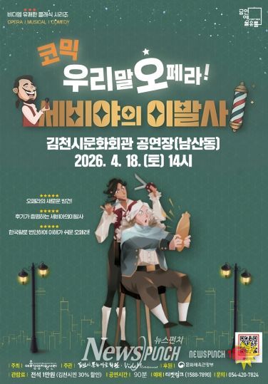 뉴스펀치 박세훈 기자 | 김천시 문화예술회관은 온 가족이 함께 웃으며 즐길 수 있는 우리말 코믹 오페라 '세비야의 이발사'를 오는 4월 18일, 김천시문화회관(남산동)에서 개최한다.