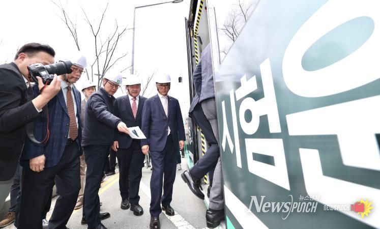 뉴스펀치 이현승 기자 | 조원휘 대전시의회 의장과 송인석 산업건설위원장이 1일 대전 유성구 도안동 호수공원 일원에서 국내 최초로 실시된 3칸 굴절차량 도로 시험 운행 현장을 점검했다.