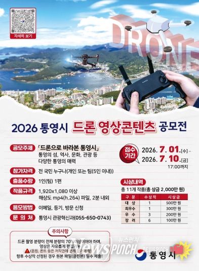 시 관계자는 “이번 공모전은 드론이라는 새로운 시선을 통해 통영시의 숨겨진 매력을 재발견하는 계기가 될 것”이라며 “많은 국민이 참여해 통영의 아름다움을 함께 나누는 뜻깊은 시간이 되기를 바란다”고 전했다.
