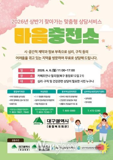 뉴스펀치 조평훈 기자 | 대구광역시 종합복지회관은 4월 3일 북구 동천동 소재 카페조안나 칠곡점에서 2026년 상반기 찾아가는 현장상담 프로그램 ‘마음충전소’를 운영한다.