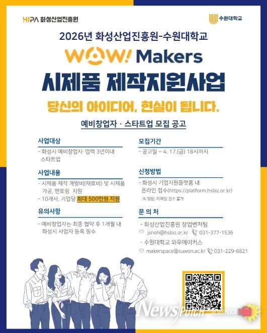 뉴스펀치 박상훈 기자 | 화성산업진흥원(원장 전병선)과 수원대학교(총장 임경숙)가 협력하여 화성시 창업기업의 아이디어를 실물로 구현하는 ‘2026년 WoW! makers 시제품 제작 지원사업’을 추진한다.