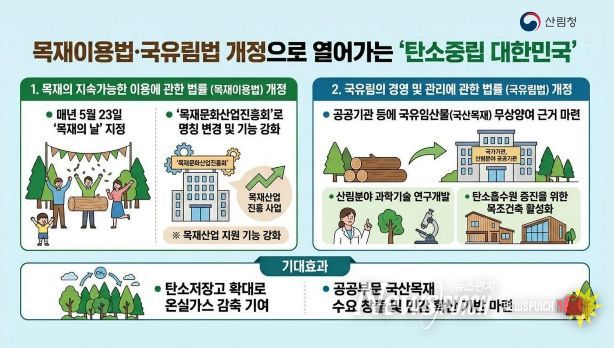 이번 법률 개정은 목재산업·문화 확산을 위한 정책을 강화하고, 국산 목재 수요 창출 효과를 이끌어 탄소저장고를 확대하고 국가 온실가스 감축목표에 기여할 것으로 기대된다.