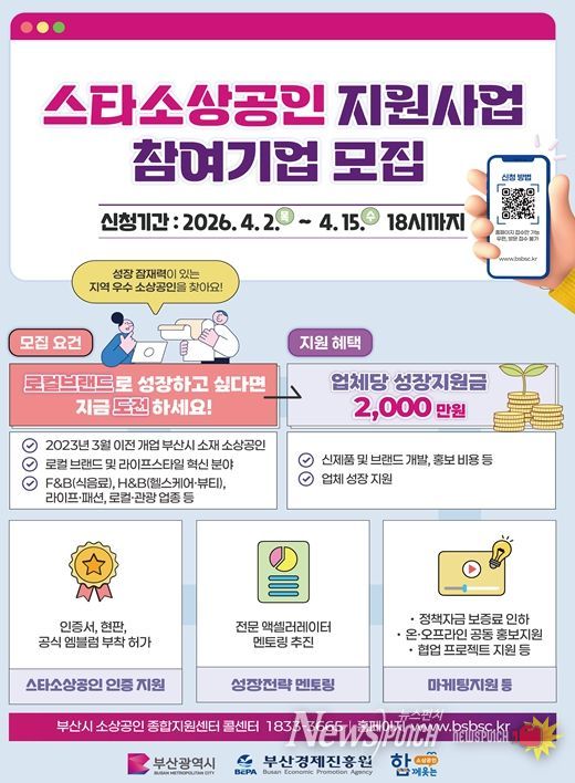 뉴스펀치 김윤걸 기자 | 부산시는 오늘(2일)부터 오는 4월 15일까지 '2026년 부산시 스타소상공인 지원사업' 참여기업을 모집한다고 밝혔다.