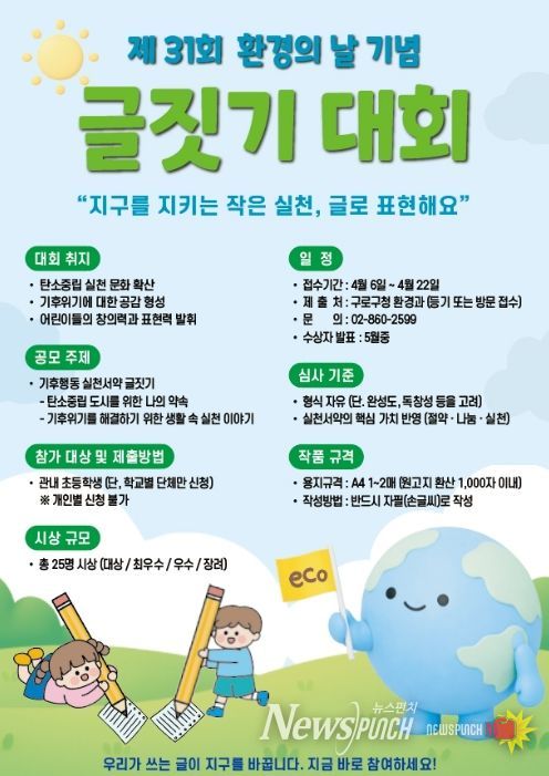 뉴스펀치 박상훈 기자 | 구로구가 제31회 환경의 날을 맞아 ‘기후행동 실천서약 글짓기 대회’를 개최한다.