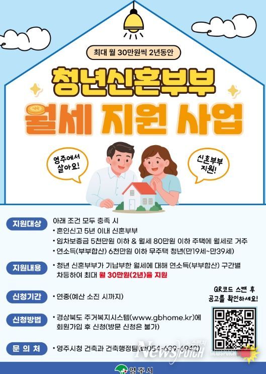 영주시 관계자는 “청년 신혼부부의 주거 안정을 위한 실질적인 지원사업인 만큼 대상자들이 빠짐없이 혜택을 받을 수 있도록 적극적인 안내와 홍보를 지속적으로 추진하겠다”고 말했다.