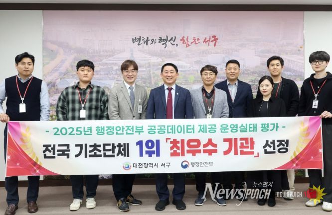 뉴스펀치 이현승 기자 | 대전 서구는 행정안전부 주관 ‘2025년 공공데이터 제공 운영실태 평가’에서 전국 226개 기초자치단체 중 유일하게‘최우수(매우 우수)’ 등급을 받으며 전국 1위를 차지했다.