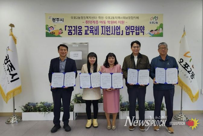 오포2동 지역사회보장협의체는 지난달 31일 취약계층 아동의 교육 격차 해소를 위해 지역 내 학원과 ‘꿈 키움 교육지원 사업’ 업무 협약식을 맺었다.