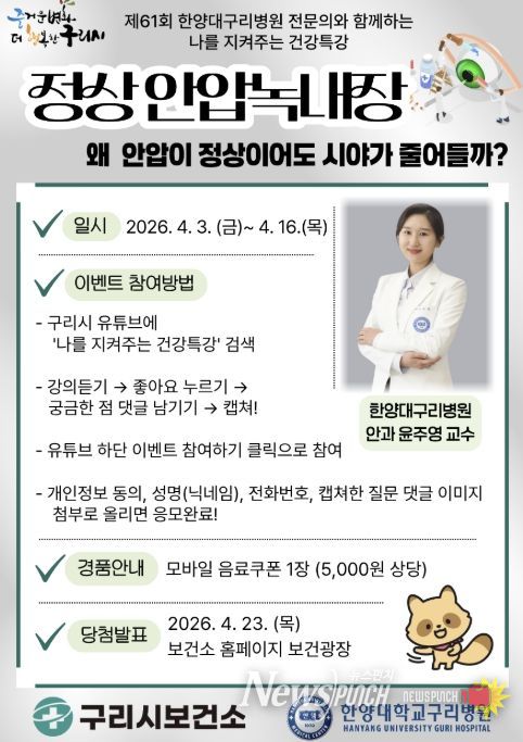 뉴스펀치 박상훈 기자 | 구리시는 4월 3일 시민들의 눈 건강 관리를 돕기 위해 시 공식 유튜브 채널 ‘구리비전’을 통해 ‘정상안압녹내장’을 주제로 한 건강특강을 송출한다고 밝혔다.