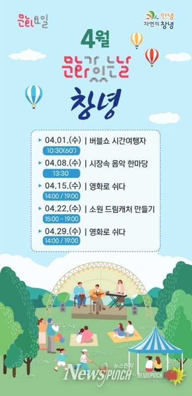 뉴스펀치 박세훈 기자 | 창녕군은 4월 한 달간 매주 수요일, 5월부터 11월까지는 첫째·셋째 주 수요일에 창녕문화예술회관에서 ‘2026 구석구석 문화가 있는 날’ 프로그램을 운영한다고 밝혔다.