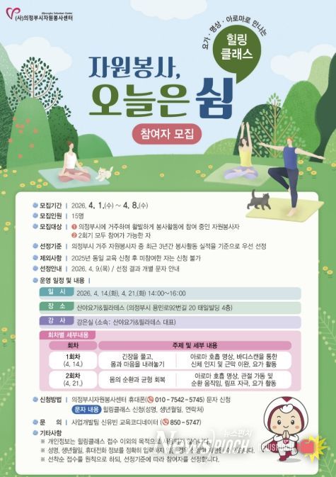 뉴스펀치 박상훈 기자 | 의정부시자원봉사센터는 4월 1일부터 4월 8일까지 자원봉사자들의 지속 가능한 자원봉사 활동 활성화를 위해 지친 몸과 마음을 회복하는 요가·명상·아로마로 만나는 힐링 클래스'자원봉사, 오늘은 쉼'참여자를 모집한다.