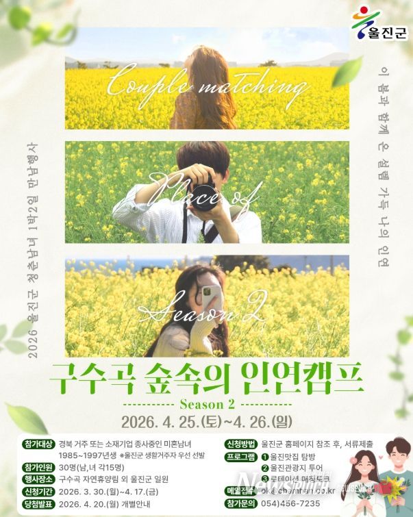 울진군 관계자는 “결혼 적령기 미혼남녀들에게 건전하고 의미 있는 만남의 기회를 제공하고자 울진의 아름다운 자연환경과 관광자원을 연계해 이번 행사를 기획했다”며 “쾌적한 울진의 봄을 느끼며 설렘이 가득한 좋은 인연을 만들고 나아가 지역 정착에도 도움이 되기를 기대한다”라고 말했다.