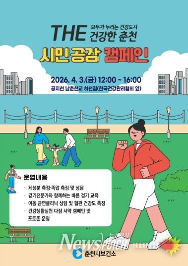 춘천시보건소는 3일 낮 12시부터 오후 4시까지 공지천 남춘천교 하천길 일대에서 ‘THE 건강한 춘천’ 시민 공감 캠페인을 열고 비만 예방과 금연 실천을 중심으로 한 통합 건강 프로그램을 운영한다.