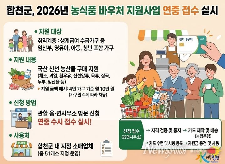 뉴스펀치 박세훈 기자 | 합천군은 취약계층이 신선한 농산물을 쉽게 맛보고 건강한 식생활을 누릴 수 있도록 ‘2026년 농식품 바우처 지원사업’을 연중 추진하고 있다고 2일 밝혔다.