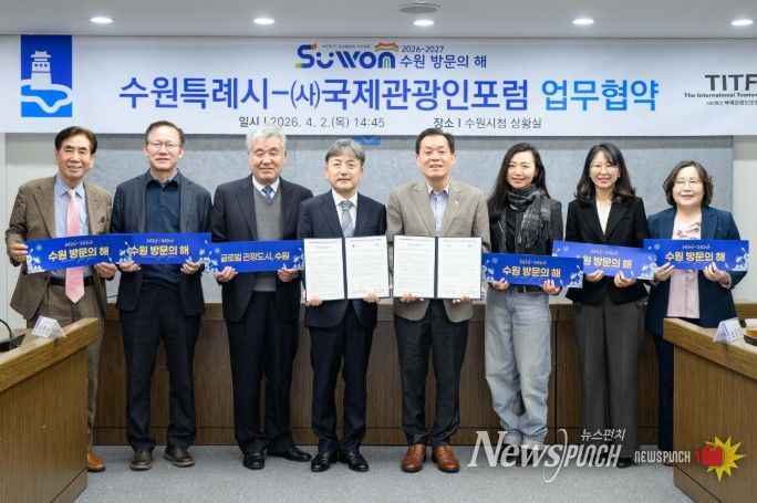 수원시와 (사)국제관광인포럼은 2일 시청 상황실에서 업무협약을 체결하고, ‘제5회 세계관광산업콘퍼런스 개최(6월 5일~6일)’와 ‘2026~2027 수원 방문의 해’의 성공적인 추진을 위해 협력하기로 했다.