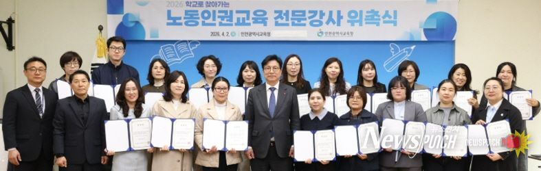 뉴스펀치 정홍균 기자 | 인천광역시교육청은 2일 학생들이 노동의 가치를 배우고 인권 감수성을 함양할 수 있도록 돕는 ‘2026학년도 학교로 찾아가는 노동인권교육 전문강사단’ 위촉식을 개최했다.