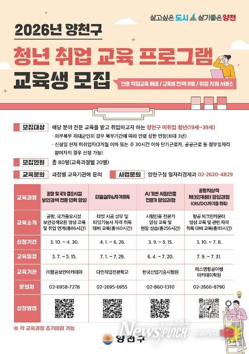 뉴스펀치 박상훈 기자 | 양천구가 지역 청년들의 구직 경쟁력을 강화하고 실질적인 취업 성공을 지원하기 위해 ‘2026년 청년 취업 교육 프로그램’을 본격적으로 운영하고, 교육생 80명을 모집한다고 밝혔다.