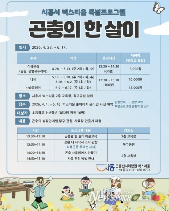 뉴스펀치 박상훈 기자 | 시흥시 곤충체험전시관 ‘벅스리움’은 오는 4월 28일부터 6월 17일까지 초등학생을 대상으로 특별프로그램 ‘곤충의 한 살이’를 운영한다.