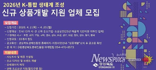 뉴스펀치 박세훈 기자 | 경상북도는 도내 유망 중소기업·소상공인의 제품 경쟁력 강화를 위해 ‘2026년 K-통합 마케팅 생태계 조성사업’의 일환으로 상품 기획부터 디자인·마케팅까지 전 과정을 지원하는‘신규 상품개발 지원사업’에 참여할 기업을 모집한다.