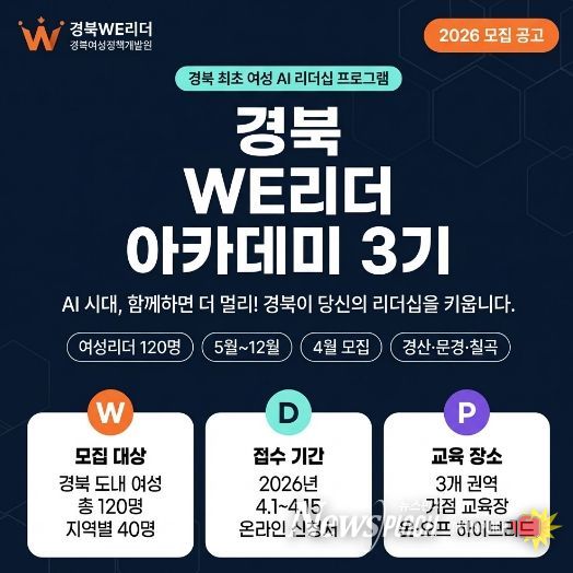 뉴스펀치 박세훈 기자 | 경상북도와 경북여성정책개발원은 지역사회와 함께 성장하고 싶은 여성리더를 대상으로‘경북 WE리더 아카데미 3기’참가자를 4월 1일부터 4월 15일까지 모집한다.