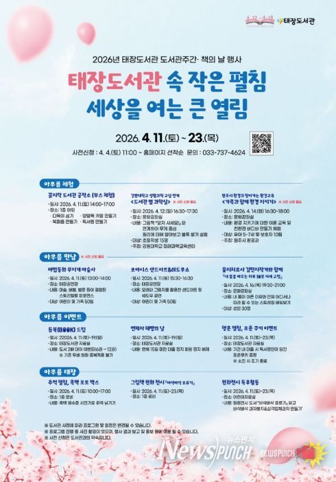 뉴스펀치 조평훈 기자 | 원주시 태장도서관은 도서관 주간 및 책의 날을 맞이해 오는 11일부터 23일까지 ‘태장도서관 속 작은 펼침, 세상을 여는 큰 열림’을 주제로 다양한 행사를 개최한다.