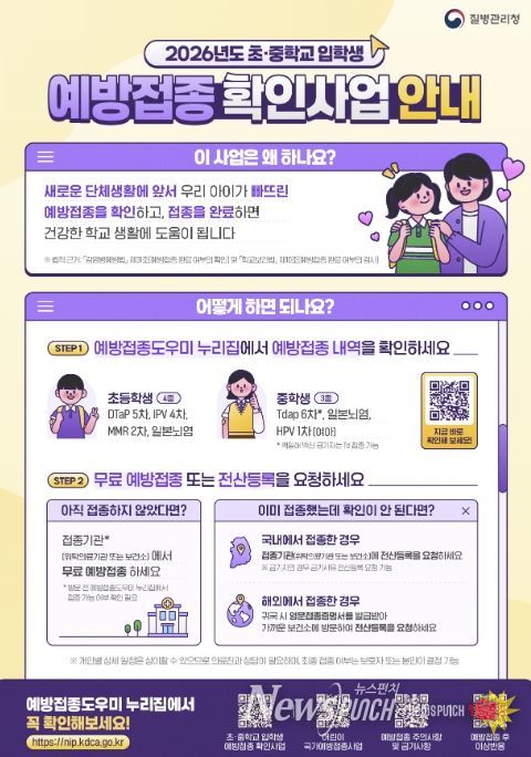 뉴스펀치 박상훈 기자 | 마포구는 질병관리청·교육부와 연계해 ‘2026년도 초·중학교 입학생 예방접종 확인사업’을 시행하고, 초·중학교 입학생의 예방접종 여부 확인을 통한 미접종자 관리에 나선다.