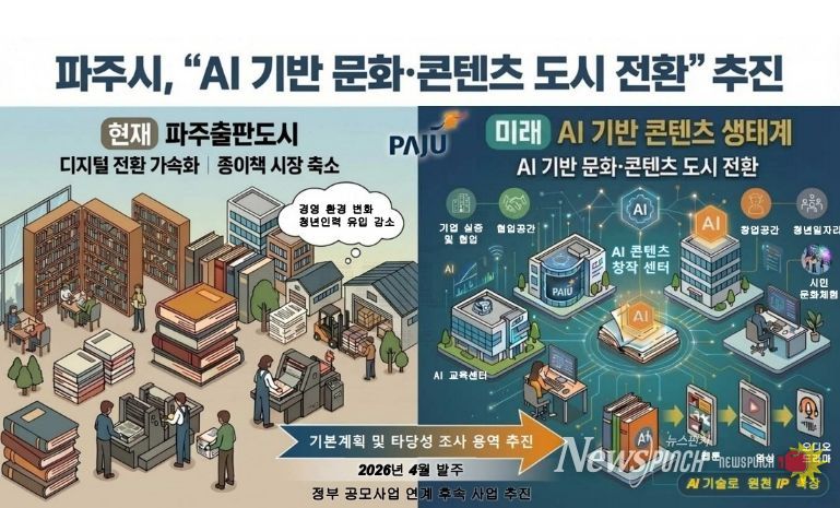 뉴스펀치 박상훈 기자 | 파주시는 출판도시의 지속 가능한 성장 기반 마련을 위해 “인공지능(AI) 기반 문화·콘텐츠 도시 전환을 위한 기본계획 및 타당성 조사 용역”을 추진한다. 관련 용역비는 2026년 제1회 추가경정예산에 신규 편성·확정됐다.