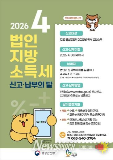 뉴스펀치 정홍균 기자 | 김제시는 이달 한달 동안 2025년 귀속 법인지방소득세 신고·납부의무 법인이 성실하게 납세의무를 이행할 수 있도록 각 법인에 안내문을 발송하고 시청 홈페이지, SNS 게시 등 다각적인 홍보활동에 나설 예정라고 밝혔다.