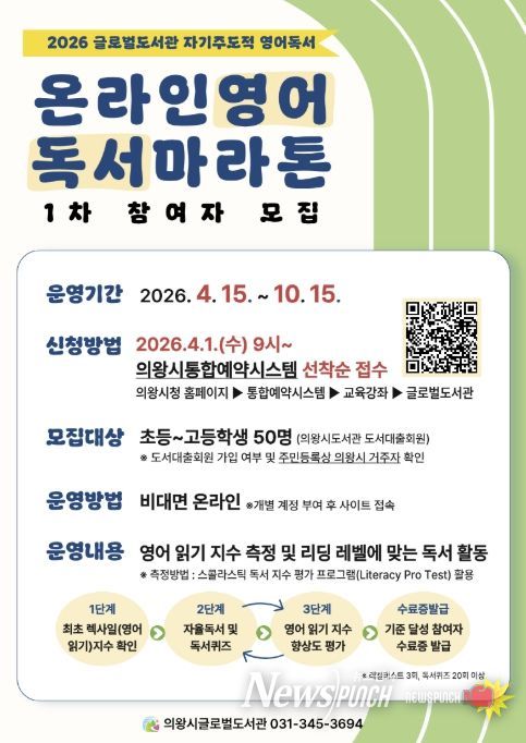 뉴스펀치 박상훈 기자 | 의왕시 글로벌도서관은 학생들의 영어 독서 흥미를 높이고 자기주도적 학습 습관 형성을 지원하기 위해 기획된 '온라인 영어독서마라톤'의 1차 참여자 50명을 모집하고 있다.