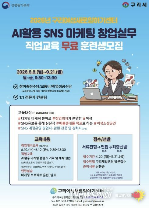 뉴스펀치 박상훈 기자 | 구리시는 구리새일센터에서 여성들의 디지털 마케팅 역량을 강화하고 성공적인 취·창업을 지원하기 위해 ‘AI 활용 SNS 마케팅 창업 실무’ 직업교육훈련 과정의 교육생을 오는 4월 20일부터 모집한다고 밝혔다.