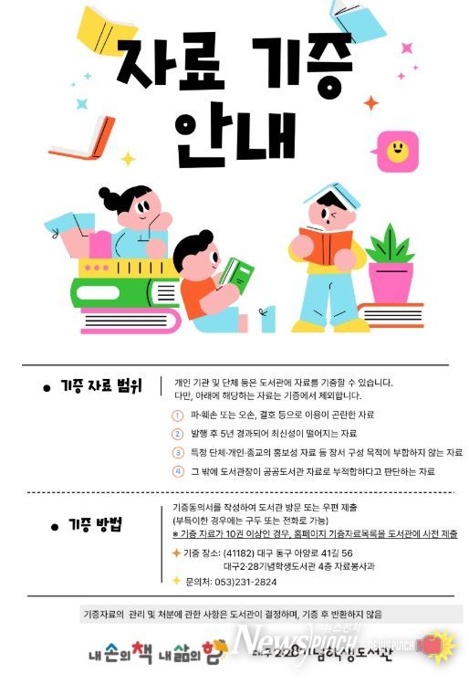 자료 기증을 희망하는 시민은 인근 대구시교육청 10개 공공도서관 자료봉사과(실)에 문의하면 자세한 안내를 받을 수 있다.