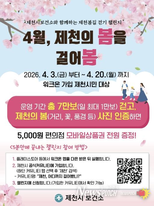 보건소 관계자는 “따뜻한 봄을 맞아 시민들이 일상에서 걷기를 실천할 수 있도록 봄을 주제로 한 워크온 챌린지를 기획했다”며 “아름다운 제천의 봄길을 걸으며 건강까지 챙길 기회가 될 것”이라고 말했다.