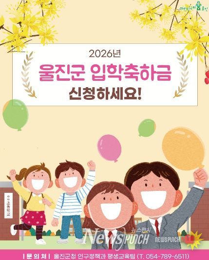 뉴스펀치 박세훈 기자 | 울진군은 학부모의 교육비 부담을 경감하고 보편적 교육복지를 실현하기 위해‘2026학년도 초·중·고등학교 신입생 입학축하금’1차분을 4월 3일 지급했다.