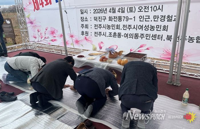 뉴스펀치 정홍균 기자 | 전주시와 전주시농민회는 4일 덕진구 화전동에서 본격적인 영농철을 앞두고 농업인의 결속을 다지고 한 해의 풍년 농사를 기원하기 위한 ‘벚꽃문화제 및 영농발대식’을 개최했다.