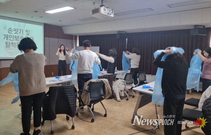 이번 교육은 시설 종사자의 감염병 대응 역량을 높이기 위해 감염병에 대한 이해, 올바른 손 씻기, 개인보호구 착‧탈의 방법 등을 중심으로 진행됐다.