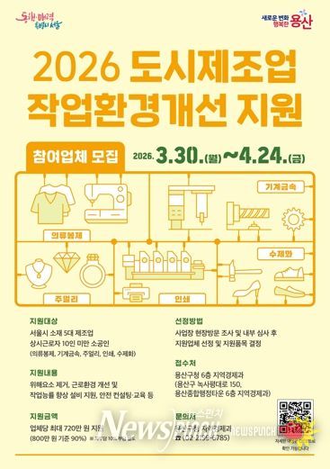 뉴스펀치 박상훈 기자 | 서울 용산구가 오는 24일까지 ‘도시제조업 작업환경개선 지원사업’에 참여할 지역 내 업체를 모집한다. 영세하고 노후화한 작업장 내 위해요인을 제거하고 설비를 개선해 작업능률을 향상시키기 위한 취지에서다.