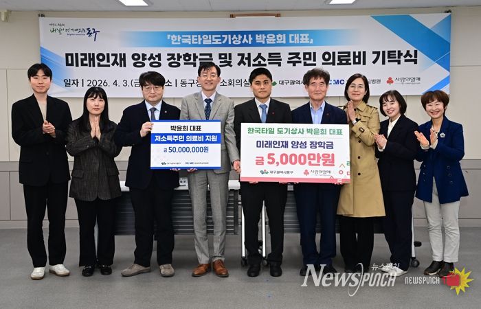 뉴스펀치 조평훈 기자 | 박윤희 한국타일도기상사 대표는 지난 3일, 지역의 미래를 짊어질 인재 양성과 의료사각지대 해소를 위한 성금 1억원을 동구청에 기탁했다.