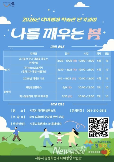 뉴스펀치 박상훈 기자 | 시흥시 대야평생학습관은 4월 6일부터 ‘나를 깨우는 봄’을 주제로 한 2026년 단기과정 및 원데이 클래스 평생학습 프로그램 수강생 모집을 시작한다.