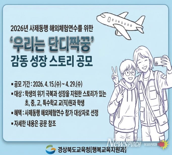 뉴스펀치 박세훈 기자 | 경북교육청은 사제간 감동적인 성장 이야기를 발굴하기 위해 ‘우리는 단디짝꿍’ 감동 성장 스토리 공모를 실시하고, 이를 통해 2026년 사제동행 해외체험연수 대상자를 선정한다고 6일 밝혔다.
