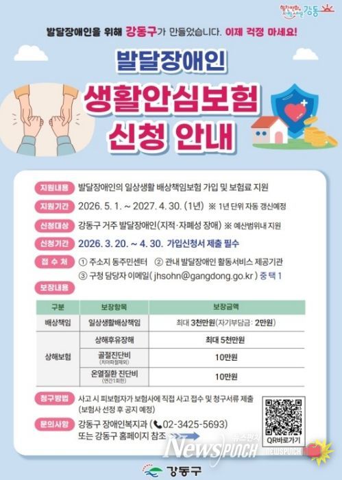 뉴스펀치 박상훈 기자 | 서울 강동구는 올해부터 발달장애인을 대상으로 전액 구비로 ‘생활안심보험’을 지원한다고 6일 밝혔다.