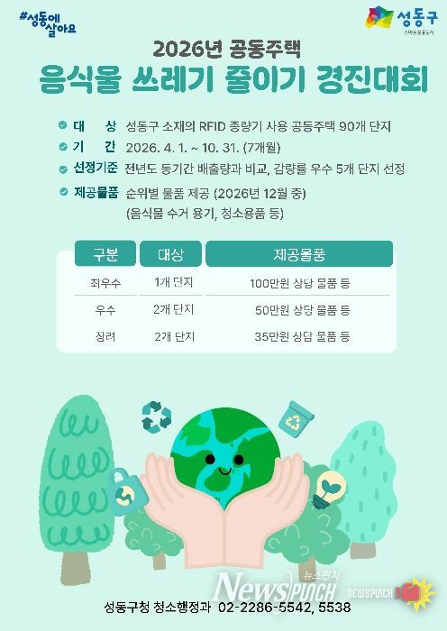 뉴스펀치 박상훈 기자 | 서울 성동구는 기후 위기 대응을 위한 생활폐기물 감량사업의 일환으로 ‘공동주택 음식물쓰레기 줄이기 경진대회’를 4월부터 추진한다고 밝혔다.