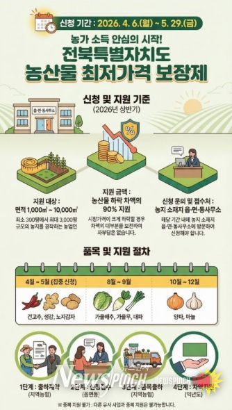 뉴스펀치 최영남 기자 | 전북특별자치도는 가격 변동성이 큰 농산물에 대한 경영안정 지원을 위해 ‘2026년 주요농산물 가격안정 지원사업’ 신청을 4월 6일부터 오는 5월 29일까지 접수한다.