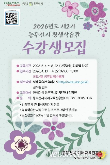 뉴스펀치 박상훈 기자 | 동두천시는 시민의 평생학습 기회 확대를 위해 2026년 평생학습관 제2기 정규 프로그램 및 5월 특강 프로그램 수강생을 모집한다고 밝혔다.