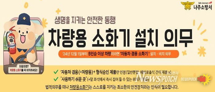 뉴스펀치 김윤걸 기자 | 나주소방서는 차량 화재는 연료, 타이어, 시트 등 다양한 가연물로 인해 짧은 시간 안에 급격히 확대될 수 있어 차량용 소화기 비치의 중요성이 커지고 있다고 밝혔다.