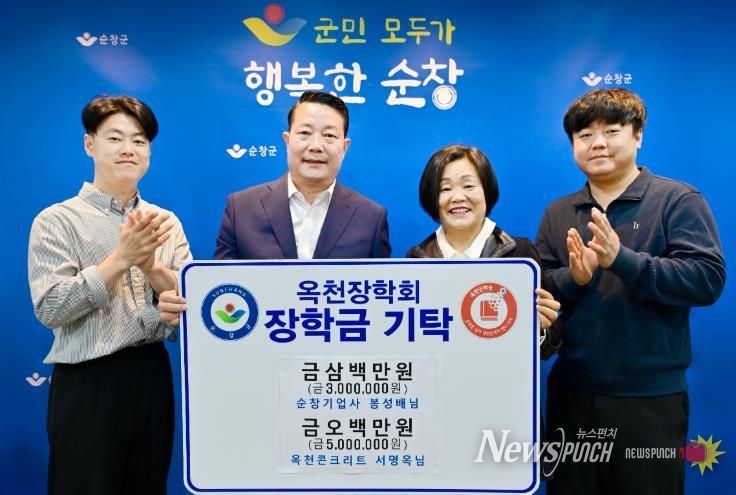 뉴스펀치 정홍균 기자 | 순창군은 6일 순창기업사와 옥천콘크리트가 (재)순창군옥천장학회에 지역인재 육성에 써달라며 장학금을 기탁했다고 밝혔다.