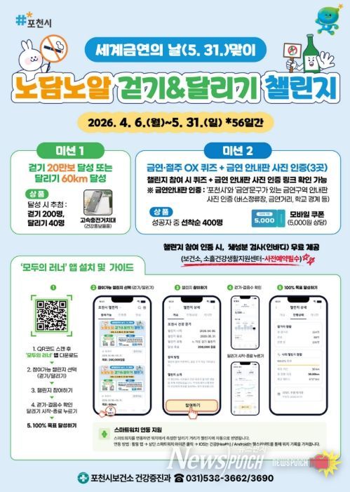 뉴스펀치 박상훈 기자 | 포천시보건소는 세계 금연의 날(5월 31일)을 맞아 ‘노담노알(금연·절주) 걷기·달리기 챌린지’를 운영한다.