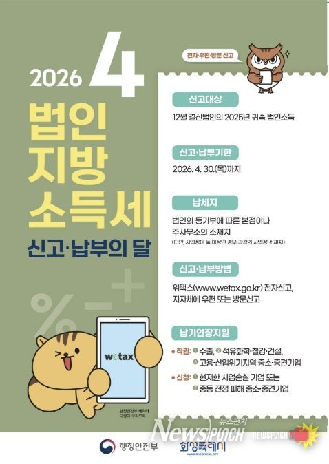 뉴스펀치 박상훈 기자 | 화성특례시가 2025년 귀속 ‘법인지방소득세 집중 신고·납부 기간’을 오는 4월 30일까지 운영한다고 밝혔다.
