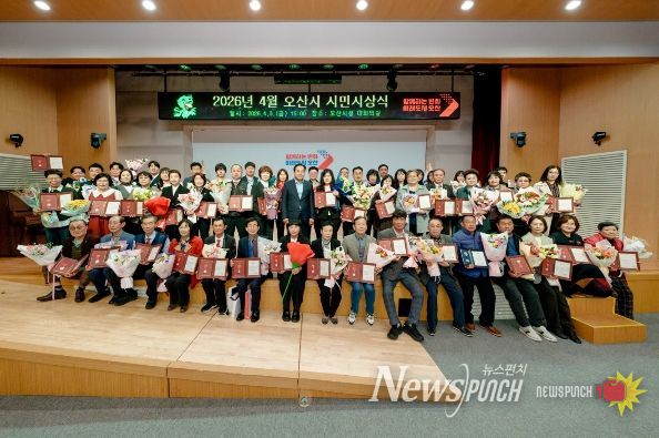 뉴스펀치 박상훈 기자 | 오산시는 지난 3일 오산시청 대회의실에서 ‘2026년 4월 시민시상식’을 개최하고 지역사회 발전과 시민 복지 증진에 기여한 유공자들을 표창했다고 밝혔다.