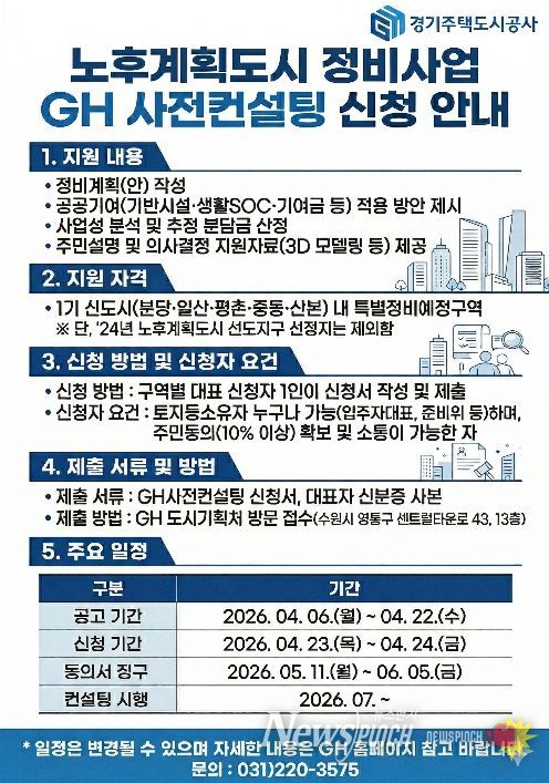 사전컨설팅 공고는 6일 GH 홈페이지를 통해 게시되며, 이달 23~24일 신청서 접수 이후 5월 주민 동의 절차를 거쳐 6월 대상 구역을 최종 선정할 예정이다. 신청서는 구역별 대표 신청자 1인이 작성·제출하면 된다.
