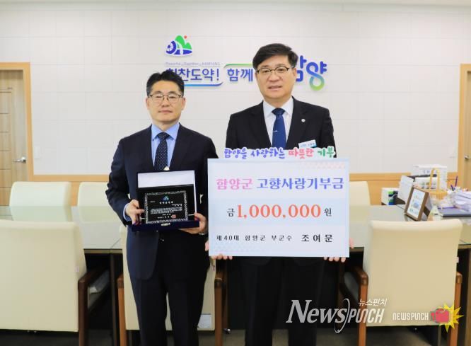 뉴스펀치 박세훈 기자 | 함양군은 제40대 조여문 전 부군수를 함양군 명예군민으로 위촉하고, 고향사랑기부금 100만 원을 기탁받았다고 밝혔다.